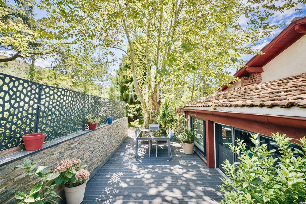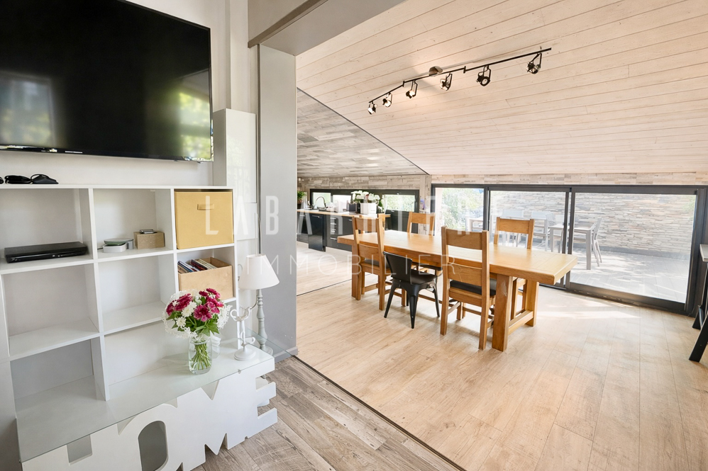 Doté de volumes bien répartis, il s’organise autour d’une pièce de vie avec cuisine ouverte sur le salon-séjour, équipée d’un poêle pour une ambiance chaleureuse. Cet espace donne accès à deux terrasses, dont une couverte, véritables extensions du séjour vers l’extérieur.
